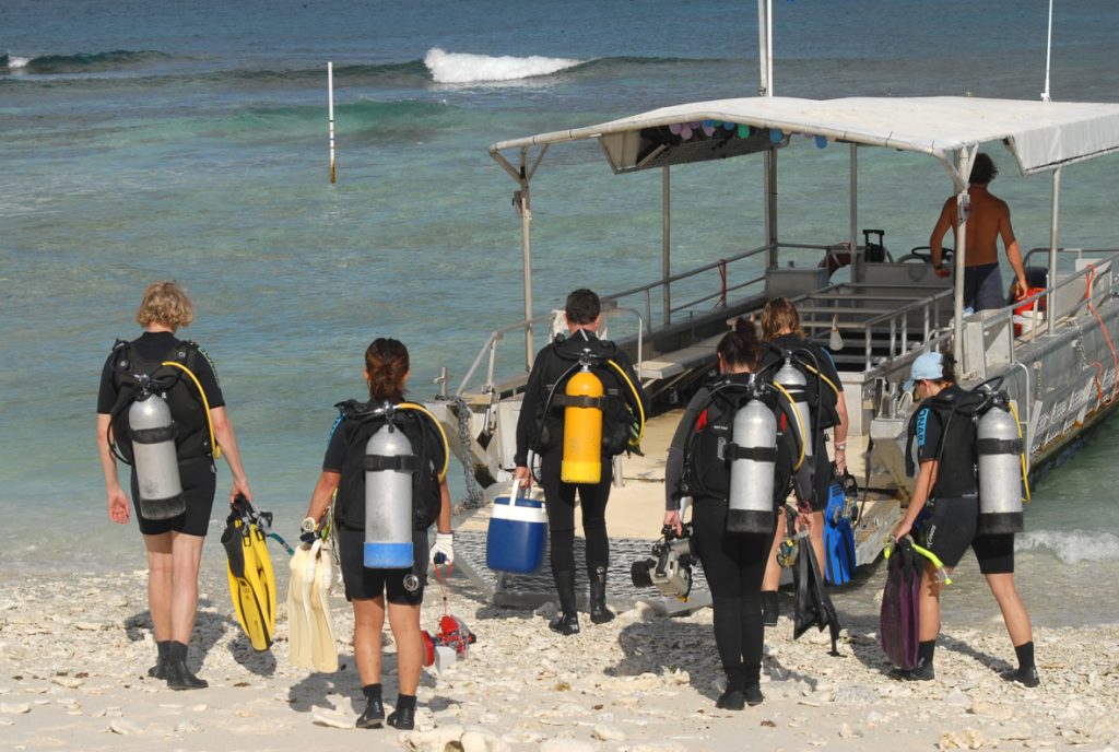 There’s no jetty on the island, so the dive boat is launched from the beach, on the sheltered leeward side of the island, close to the lighthouse. Depending on the tide, divers may have to navigate a walk over a designated area of reef flat with tanks and weights in order to get aboard. Anyway, it’s not too difficult and there’s always help from the crew if you’re unsteady.