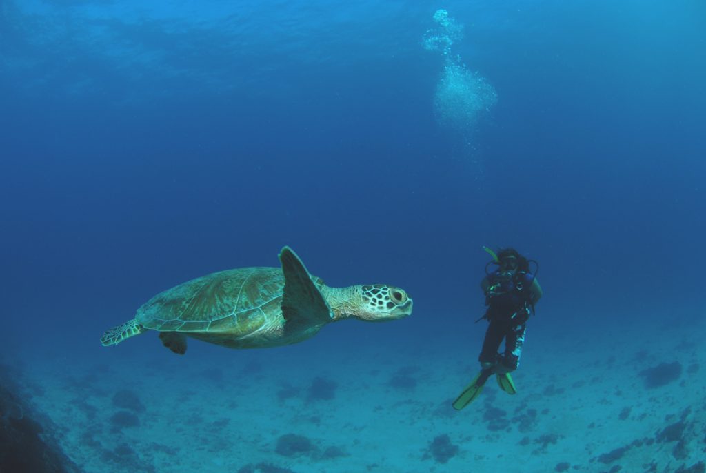 On the leeward side there’s also plenty to keep divers happy, with the underwater topography consisting of reef flat, a sloping reef, and bommies interspersed with sandy expanses.