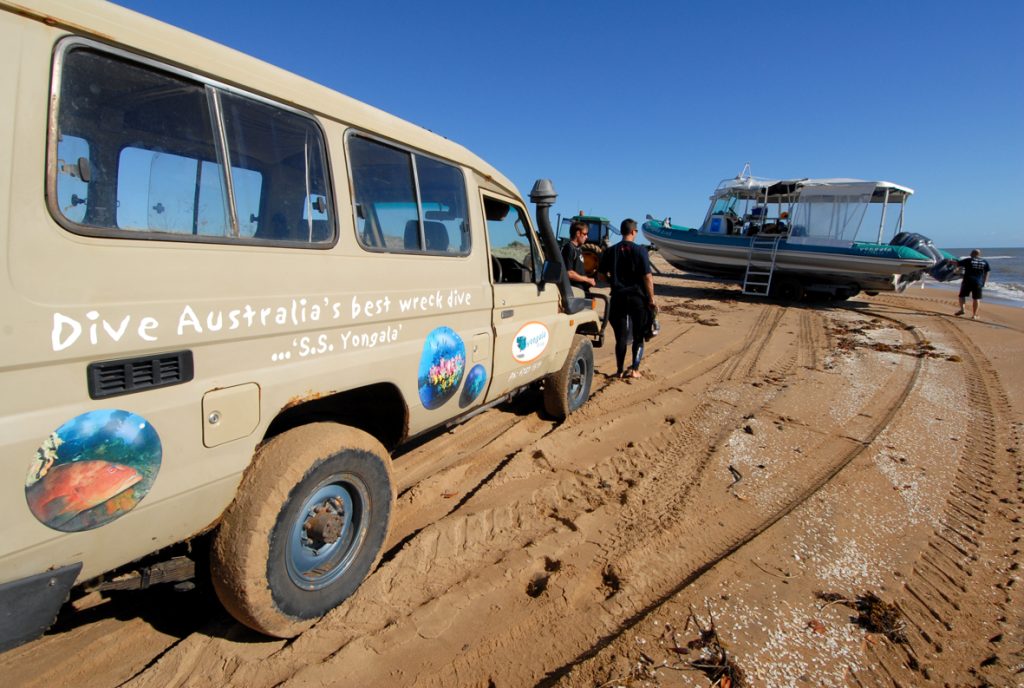 A day’s diving to the wreck aboard the Yongala Express is a little adventure. It begins with an early meet and briefing at the dive centre, followed by a bumpy 4 x 4 ride onto the deserted Alva Beach from where the Yongala Express is launched. A tractor is used to tow the Yongala Express onto the beach, backing it into the sea to get it afloat.