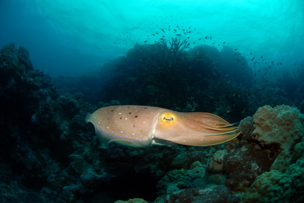 Pixie Gardens is a nice site with sandy expanses, coral slopes, bommies and some cuts in the reef up in the shallows that are interesting to check out. On the night dive, we didn’t stray far from the boat and spent the entire dive on a couple of the larger bommies and out on the sand. Hunting jacks continually hang out with you, looking for any hapless fish that your lamp may illuminate. It’s also worth spending a bit of time underneath the boat before getting back onboard, as even more jacks, red bass and the odd reef shark swirl around in hopeful circles, waiting for a chance to feed.