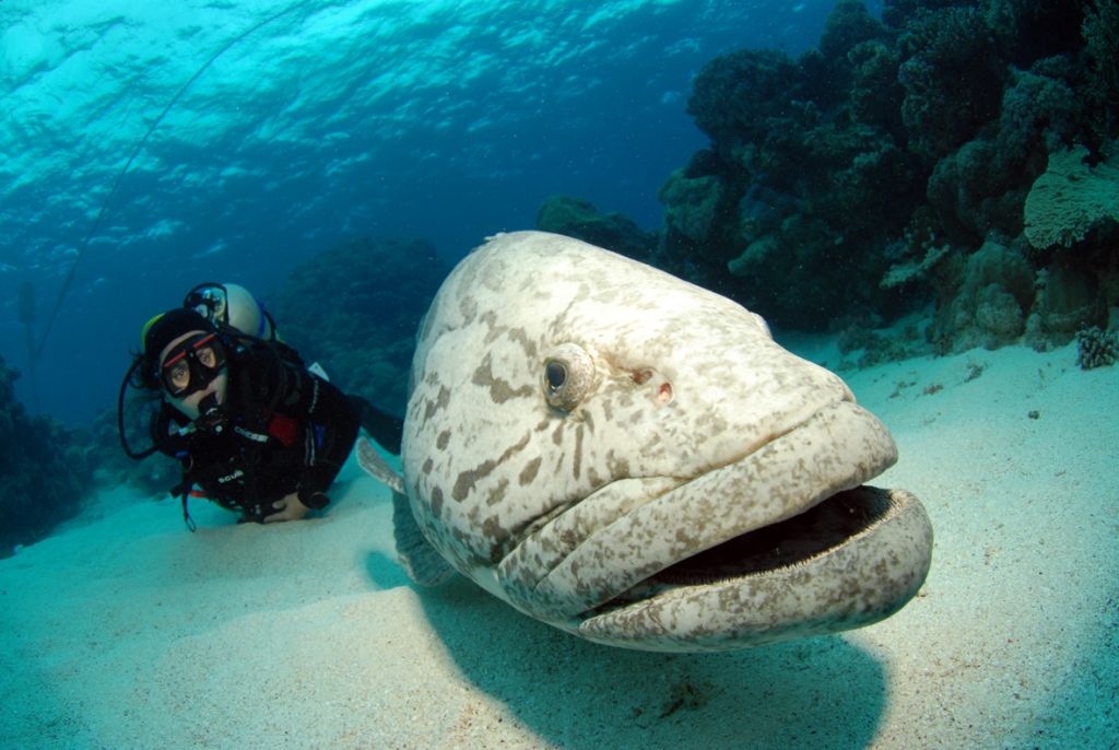 The second dive was the “cod feed” itself, which involves the crew luring these huge fish to the sandy “arena” with a holed container of “bait” filled with a concoction of dead fish and chum. Once in the water, the divers all assemble in a large circle on the sand and wait for Mossy to appear and administer the food, acting as a kind of “master of ceremonies”. Several large potato cod and other fish such as red bass remain glued to the container, transfixed by its contents, as Mossy led the obsessed fish past each of the divers. To add to the show, he would also hand feed the cod. The dive is chaotic and fun.