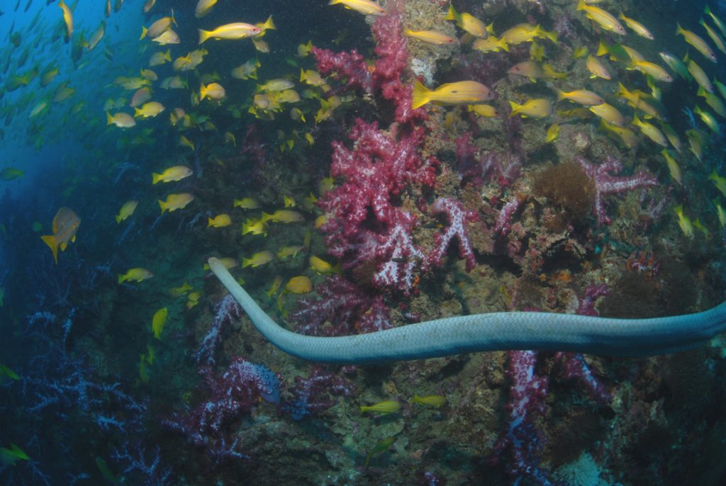 This profusion attracts an amazing concentration of larger predators. Most divers can expect to see batfish, jacks, Maori wrasse, stingrays, barracuda, turtles, olive sea snakes and gigantic Queensland groupers. The more fortunate might encounter eagle rays, mantas, several species of shark and dolphins. There’s even a report of a humpback whale that cruised past the wreck on one occasion!