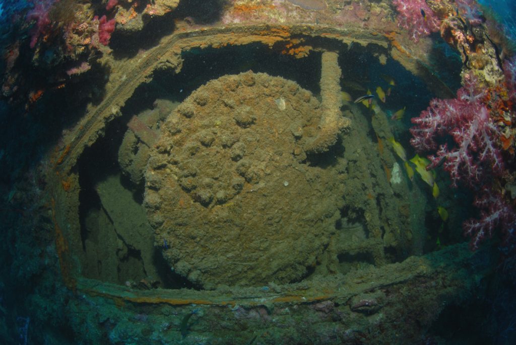 It’s remarkably well preserved and rests on sand in 28 metres of water, with shallowest part of the wreck at 14 metres. Currents can often be strong and the visibility around the wreck is extremely variable. If you get 10-15 metres of visibility, consider yourself lucky.