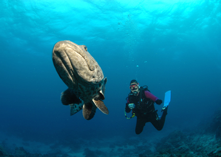 The second dive is the “cod feed” itself, which involves the crew luring these huge fish to the sandy “arena” with a holed container of “bait” – an irresistible concoction of dead fish and chum. Once in the water, the divers all assemble in a large circle on the sand and wait for the container to be brought past. Several large Potato Cod and other fish such as red bass remain glued to the container, transfixed by its contents. To add to the spectacle, the crew also hand feed the cod with fish. The dive is really good fun and great for photography.