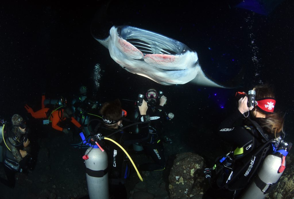 After the morning dives at a couple of sites including the enjoyable Paradise Pinnacle, we headed north past Kona to Garden Eel Cove, the site of Hawaii’s “signature” dive – the incredible manta ray night dive. The history of these encounters dates back to the Kona Surf Hotel (now the Sheraton) to the south of Kona where lights were installed to illuminate the water for the benefit of the guests. The lights attracted plankton, which attracted mantas, which attracted divers, who put in even more lights. This unique “symbiosis” has happened ever since, although most of the mantas “migrated” to the current site close to the airport.
