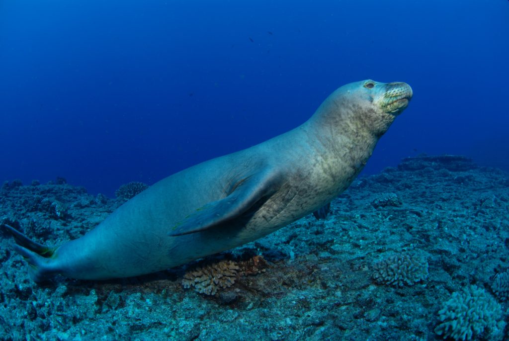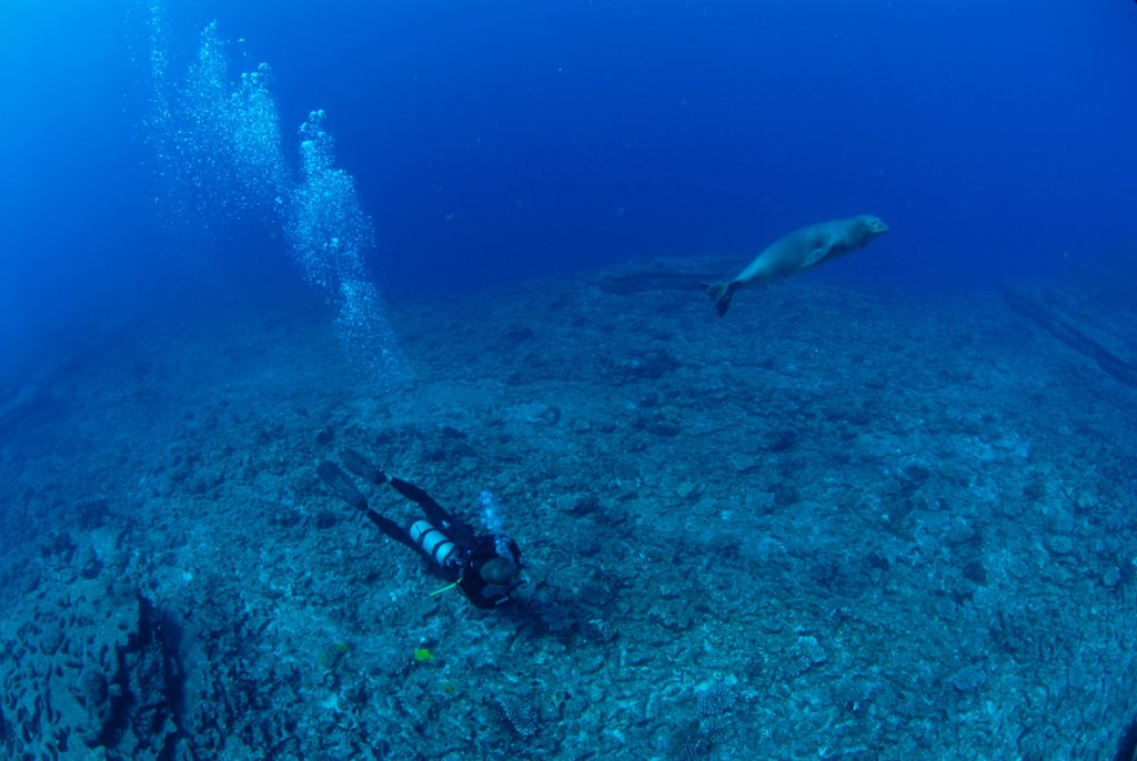 Although sometimes curious of divers, Hawaiian Monk Seals can also be skittish and wary, and are more likely to stick around if divers don’t swim directly at them. Instead, a slower and more “meandering” approach tends to be more successful and if you’re able to get close, it’s a good idea to ensure that the seal has enough space to make an exit. Sporadic rather than constant eye contact were also considered good advice as it’s thought that the seals finds it less threatening.