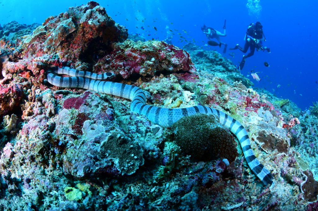 As I’ve dedicated most of this section of the feature to our successful Mola Mola quest, I musn’t forget to squeeze in some other important mentions, such as the presence of Manta Rays. On each diving day, we travelled along the wild Southern coastline of Nusa Penida to a site called Manta Point. Like Crystal Bay, it’s usually very busy with dive boats, but the mantas are virtually guaranteed. In fact, you might even see the two species of manta, the reef manta and the giant manta; we were fortunate and saw both. Other impressive lifeforms from the Nusa Penida sites we visited include turtles and some alarmingly large sea snakes.