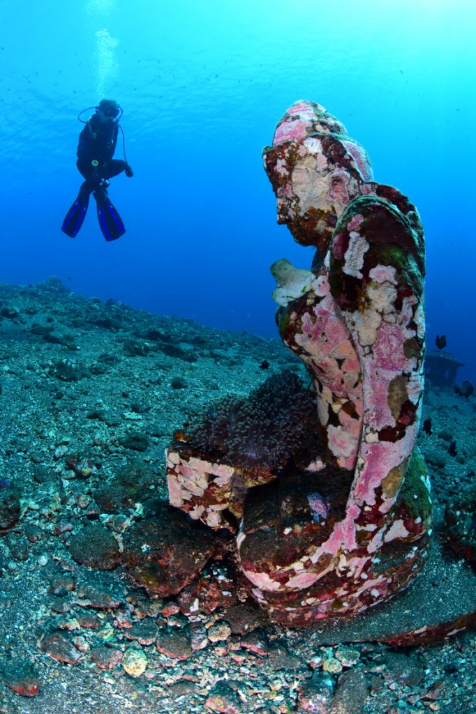 Around Tulamben, the local dive operations have placed artificial reefs and wrecks at some sites, with a view to attracting additional life for the benefit of both divers and the environment. These are always worth spending time around, where predators such as eels, scorpionfish, lionfish and frogfish can often be found feasting on the more concentrated amounts of prey. At Seraya, there’s some interesting structures to explore, and along at Tulamben itself there’s an underwater sculpture garden featuring various statues (such as Hindu gods) and an “aeroplane” wreck for added interest and novelty, though the actual structure had deteriorated since my visit five years ago.
