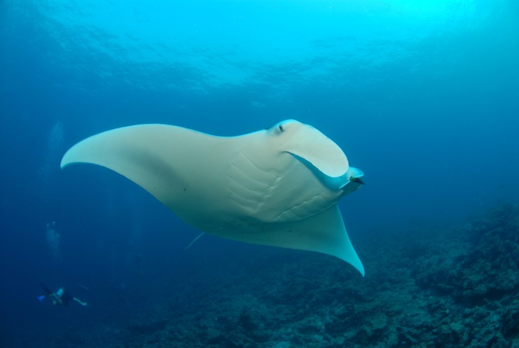 The Maldives are known for drift dives, some of which achieve an almost legendary status among the dive community. We visited a site called Lankan Reef which promised a fast moving show, but when we arrived there the current was slight, almost non-existent. It also boasted a manta cleaning station which we would pass en route down the reef, but it was too early in the year for manta ray encounters (it was April, and the season is May – November). Or was it?