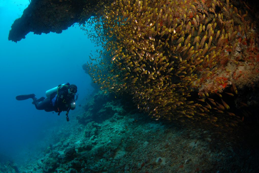 As a manta ray could be considered a symbol of freedom, the Maldives probably doesn’t strike you as the kind of place that needs a prison, but yes, there is one. And it has its own island, which boasts a dive site called Feydhoo Caves. It makes for an interesting “wall and drift” dive, though the visibility is sometimes impaired compared to other sites in the area. What it does offer is some interesting topography and encounters. We found numerous moray eels and lobsters peering from their lairs in the wall and ledges that harboured resting turtles. Several scorpion fish and lionfish, along with healthy congregations of batfish and tuna were also enjoyable at this site. Photographically, it yielded a few interesting shots including a turtle launching off a ledge.