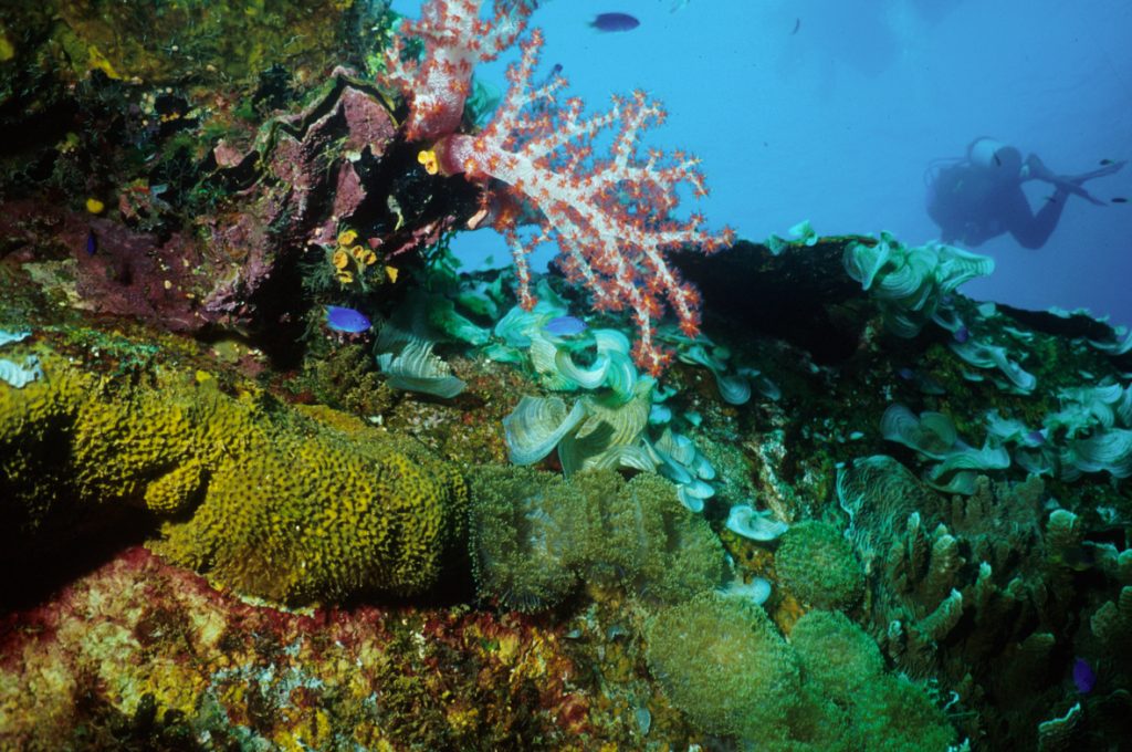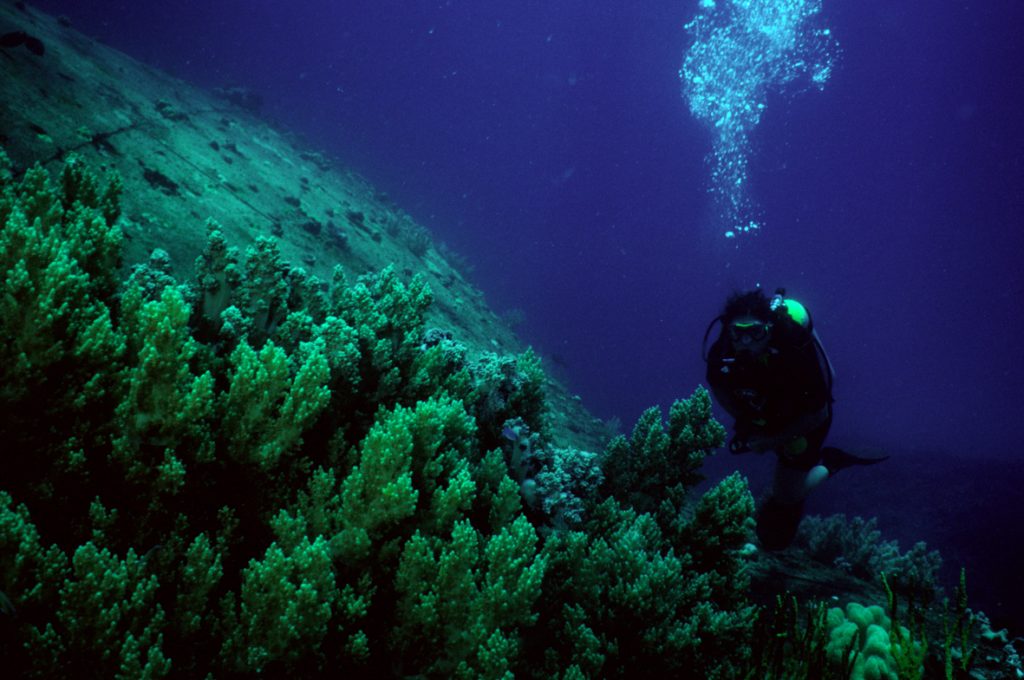In the fifty odd years since the battle, these huge wrecks have become microcosms of the wider oceanic world. Many are now festooned with corals, sponges, clams and anemones, which in turn attract dazzling arrays of reef fish. Also, sharks, jacks, barracudas, stingrays and turtles can often be found in the vicinity of the wrecks.