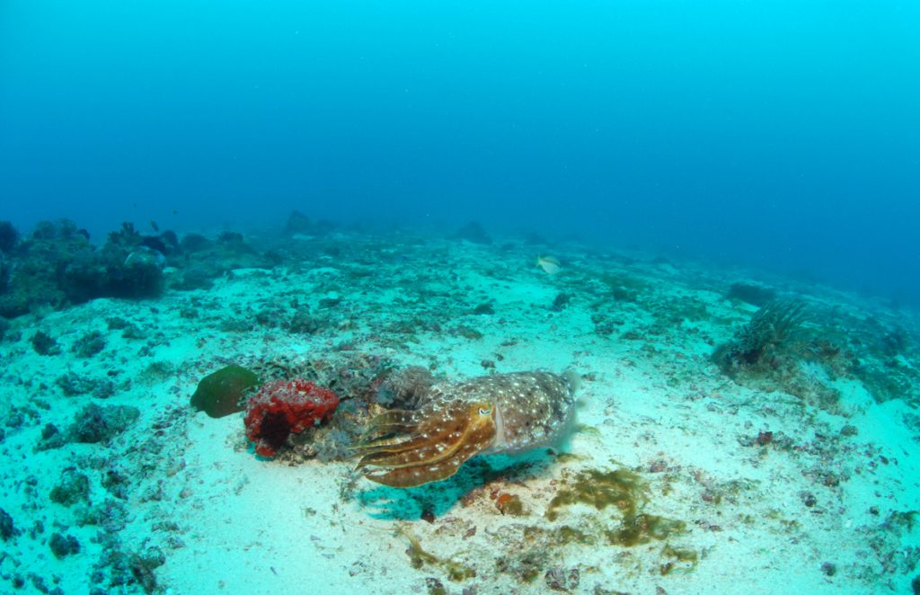 On the very first dive, we encountered a single manta, which was encouraging, but not on the following two dives. Other sightings included a school of jacks, a cuttlefish and a couple of white tip reef sharks. I was told that whale sharks are occasionally seen here (the best time is April and May) and that other sharks such as hammerheads and even threshers are not unknown, though certainly not reliable. It wasn’t easy diving, and certainly not one for the novices. Perhaps the conditions are sometimes easier out there.