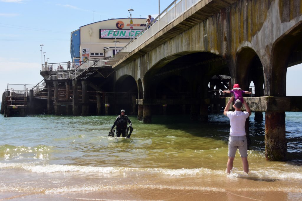 Bournemouth beach is regularly patrolled by lifeguards (certainly at peak times) who may ask you what you’re doing, but they won’t stop you. One lifeguard approached us that happened to be a diver. He confirmed that it’s an interesting dive, having done it himself in the past.