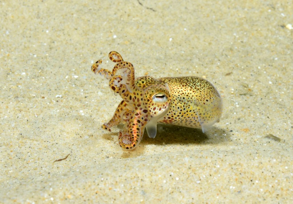 The highlight for me was encountering a small Bobtail Squid (Sepiola atlantica) which I managed to photograph. As this species is closely related to cuttlefish, it’s also known as the Little Cuttlefish which can be confusing for ID fanatics, Once I spotted it, I pursued it around the sand for a while as it changed colour in irritation (or mortal fear) of my persistent attentions. Eventually, it jetted away in a tiny squirt of ink.