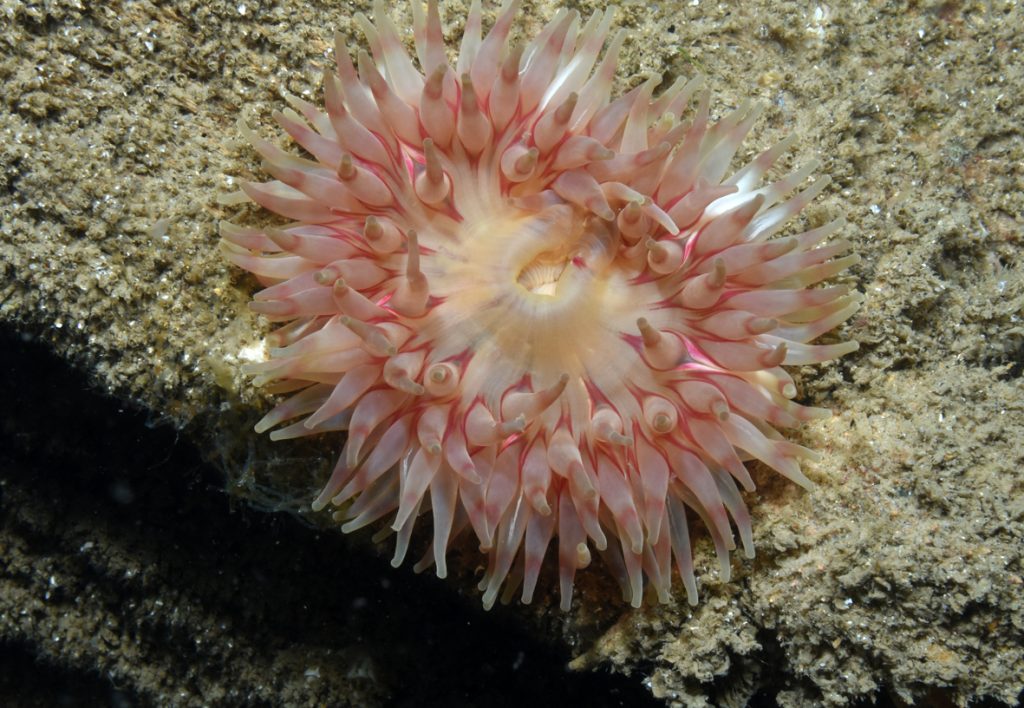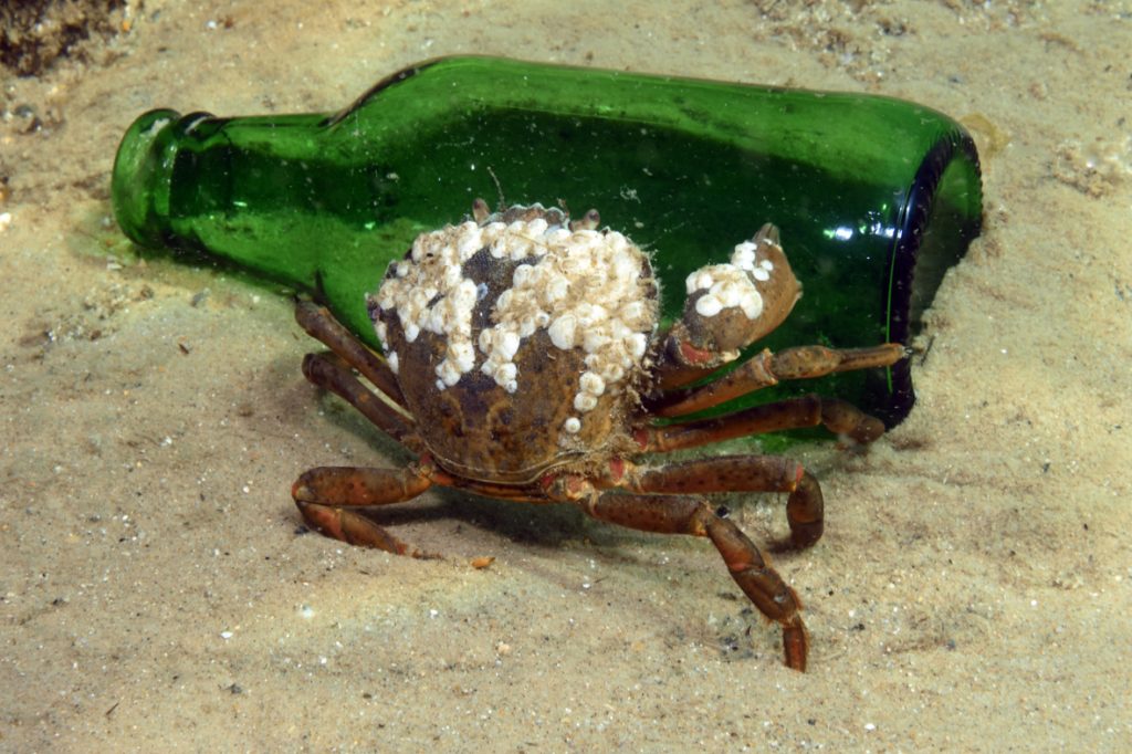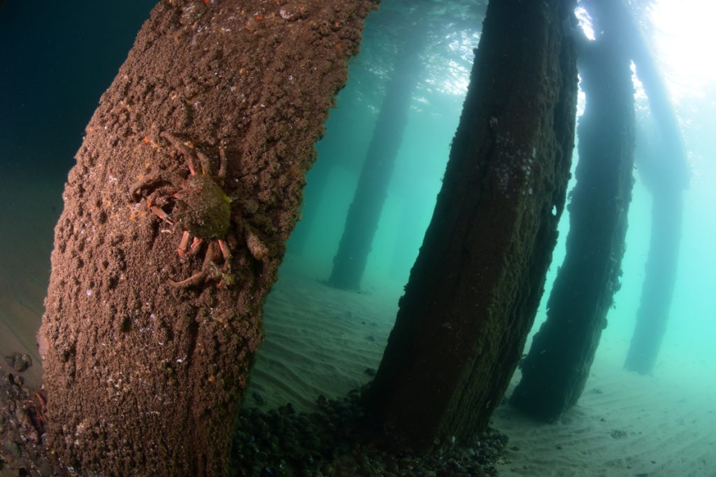 In terms of the pier structure itself, the legs and supporting beams are very active and sometimes colourful, at times reminding me of more tropical piers that I’d dived in the past. Close scrutiny revealed them to be alive with crabs, assorted growth, mussels, anemones, wrasse and even a tiny scorpionfish. I’m sure more dives would reveal many other species.