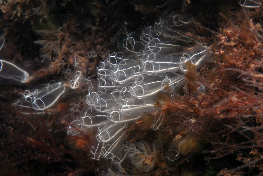 We also spotted schools of Bass flashing by, and some sizeable Wrasse (including one with a parasite). Other fish sightings included gobies skulking in the weed. We didn’t see any seahorses and perhaps surprisingly no pipefish either. One interesting, but very fleeting encounter was what I believed to be a tiny squid that jetted away, not to be seen again when I went to check it out. Owing to its sheltered geography, the bay also appears to be an important “fish nursery”, with numerous fish fry being present.