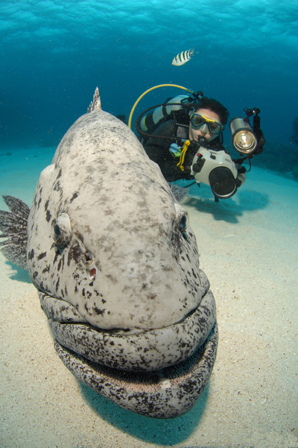 The “cod feed” involves the crew luring these huge fish to a large sandy “arena” with a holed container of “bait” – an irresistible concoction of dead fish and chum. Once in the water, the divers assemble in a large circle on the sand and wait for the container to be brought past. Several large Potato Cod remain glued to the container, transfixed by its contents. To add to the spectacle, the crew also hand feed the cod with fish.