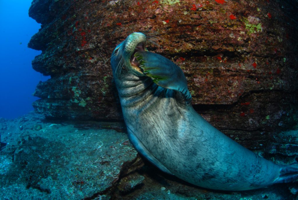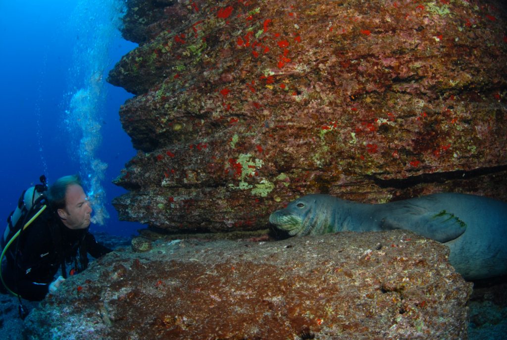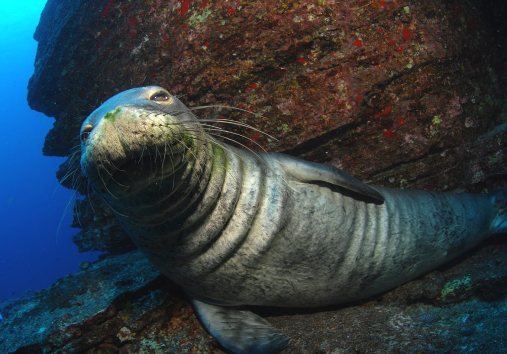 Although sometimes curious of divers, Hawaiian Monk Seals are often skittish and wary, and are more likely to stick around if divers don’t swim directly at them. Instead, a slower and more “meandering” approach tends to be more successful and if you’re able to get close, it’s a good idea to ensure that the seal has enough space to make an exit. Sporadic rather than constant eye contact were also considered good advice as it’s thought that the seals finds it less threatening.